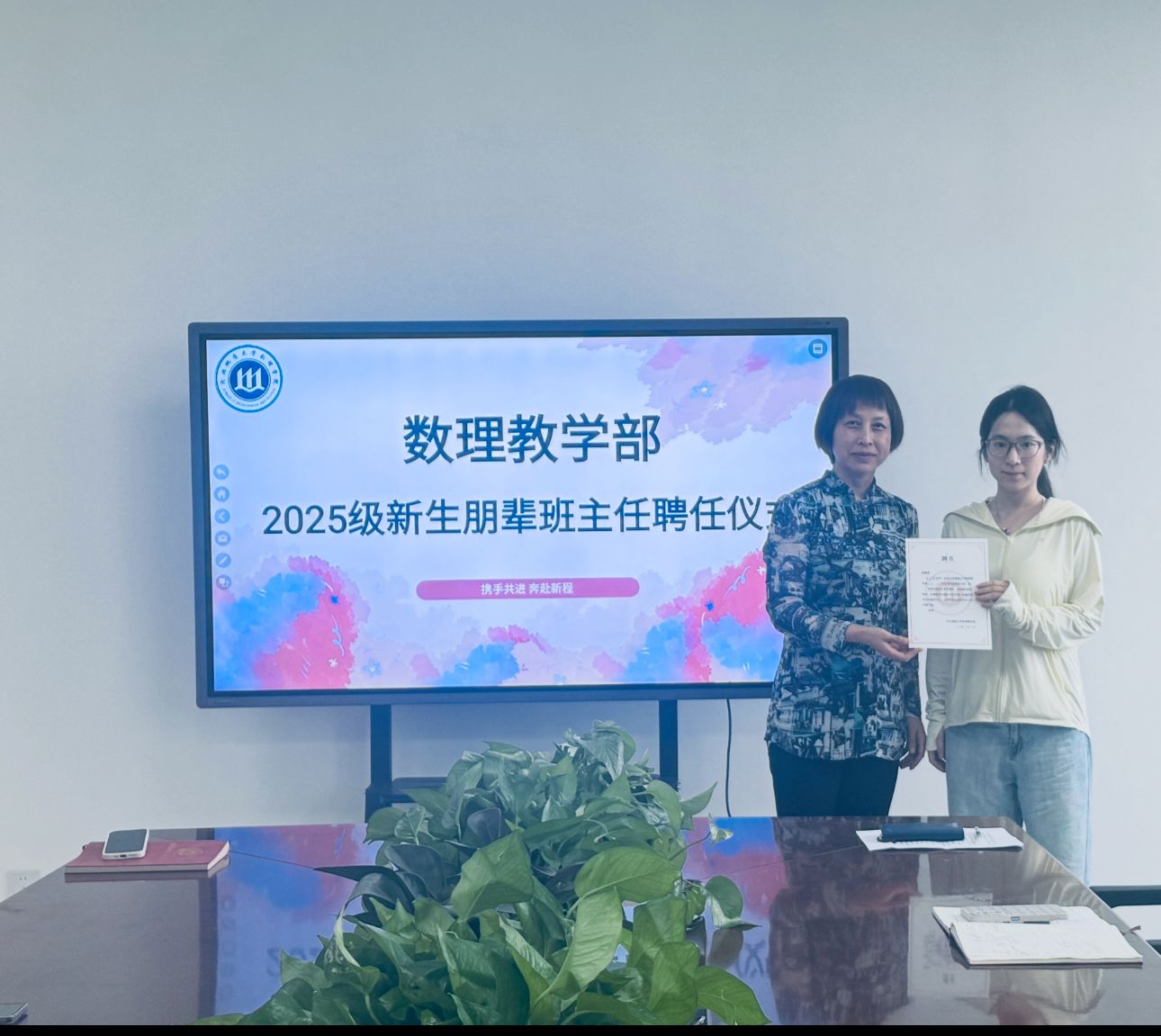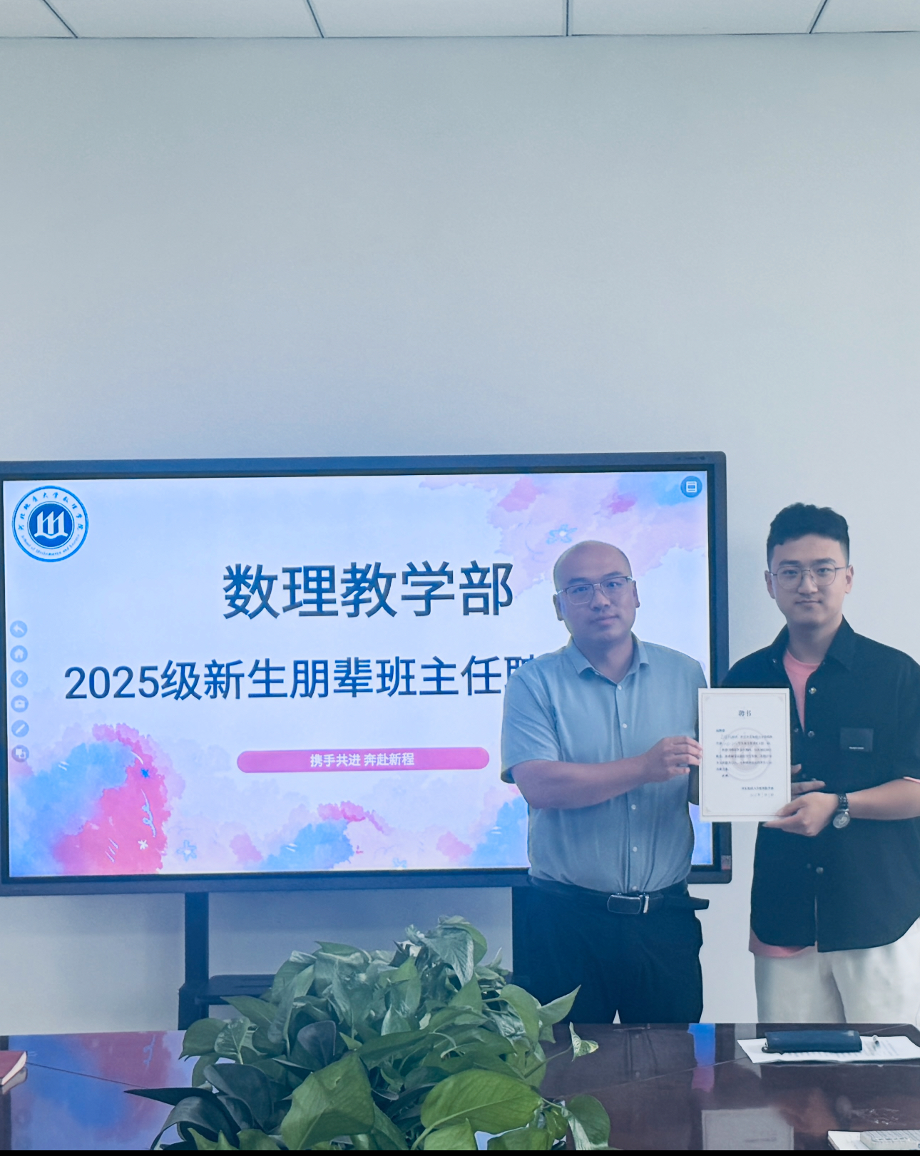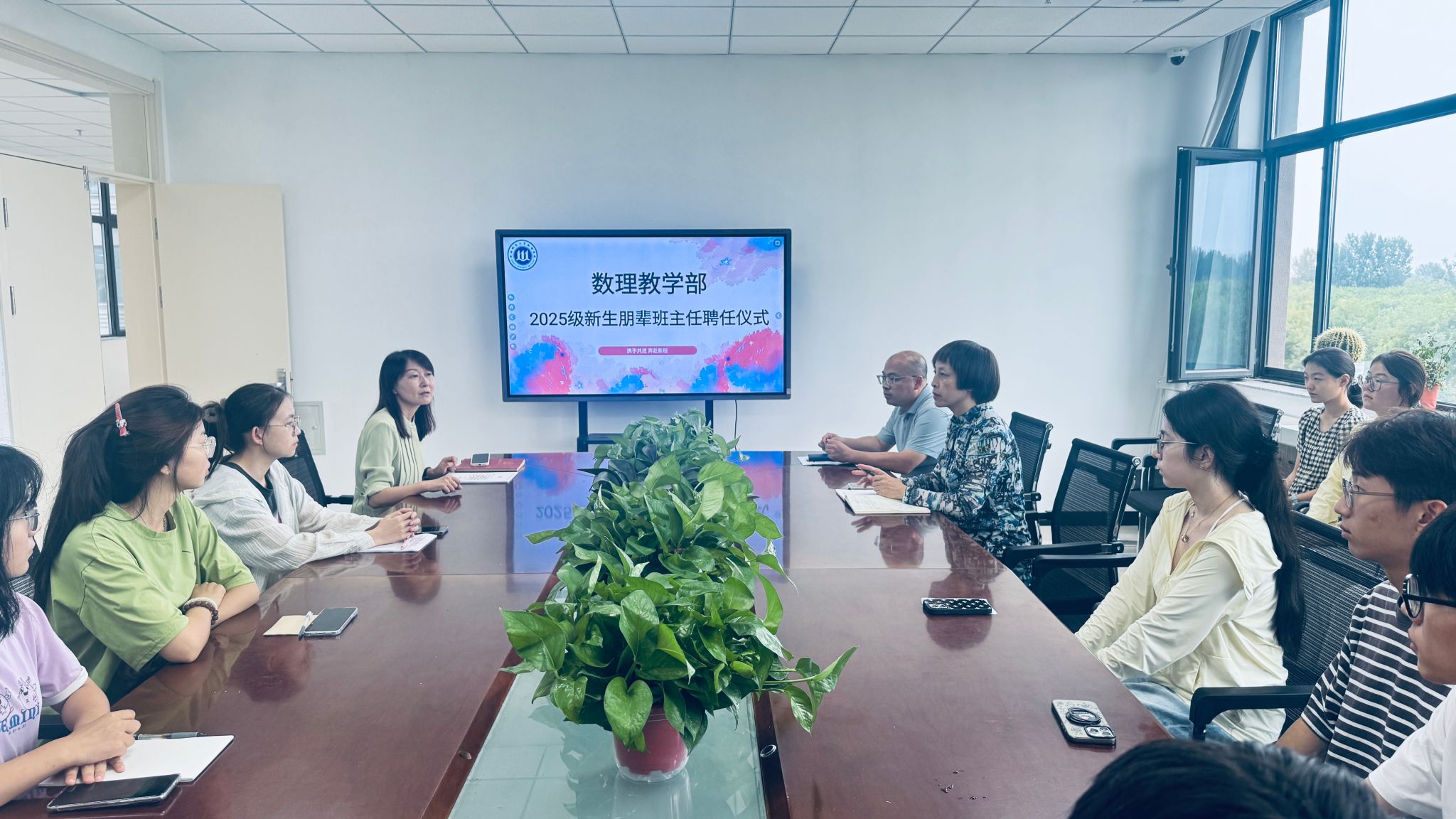 2025年9月11日下午,数理教学部在实验楼333会议室举行2025级新生朋辈班主任聘任仪式,教学部党委书记李占乔,主任董昌州、副书记张凝宁,新生辅导员李伟,以及14位新生朋辈班主任参会。